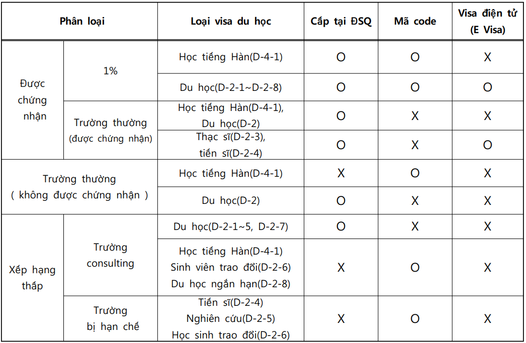Đối với visa du học tiếng D-4-1, tất cả các trường đại học nằm trong danh sách trường thường (không được chứng nhận) và các trường ở vị trí thấp hơn sẽ chỉ được phép thu nộp visa theo dạng mã code.
