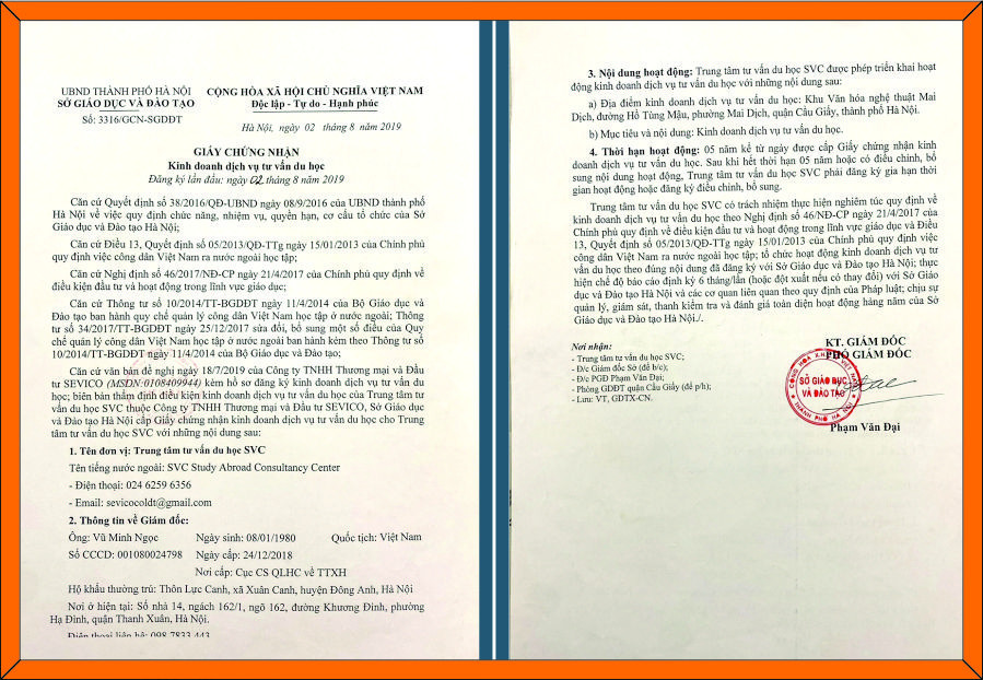 SVC được sở kế hoạch và đầu tư thành phố Hà Nội cấp phép hoạt động trong lĩnh vực hỗ trợ giáo dục theo giấy phép kinh doanh 0108409944 đầy đủ, đảm bảo sự uy tín và hợp pháp, Bên cạnh đó chúng tôi sở hữu mạng lưới đối tác toàn cầu và liên kết với các trường đại học, cao đẳng nổi tiếng tại Hàn Quốc và Nhật Bản