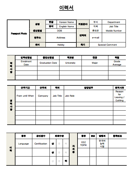 Bố cục mẫu CV tiếng Hàn khá giống với CV tiếng Việt, gồm các phần như sau: